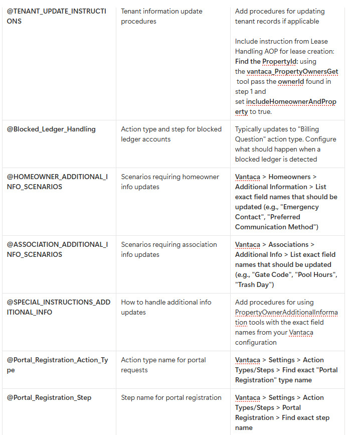 | @Owner_Response_Step | Step names for responding to owners | Vantaca > Settings > Action Types/Steps > Find exact step names for owner responses |