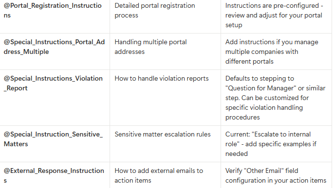 | @Special_Instructions_Responses | Response style guidelines | Current setting: "Be clear and concise." Customize as needed |