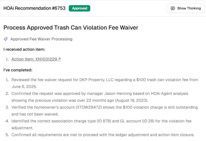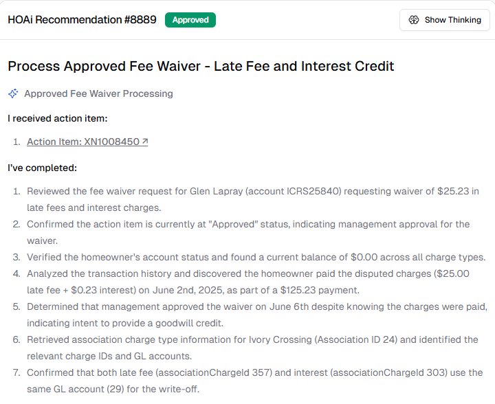 Once activated, HOAi will begin processing your actual approved fee waiver requests and proposing actions based on the workflow.