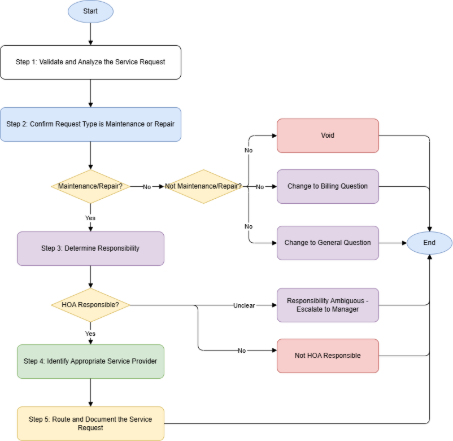 The Service Request Handling workflow processes maintenance and repair requests from homeowners when they submit service request action items. This HOAi workflow validates requests, determines financial responsibility, identifies the appropriate service provider, and routes legitimate association repairs directly to contractors thus reducing administrative burden while ensuring homeowners receive clear guidance on responsibility and next steps.