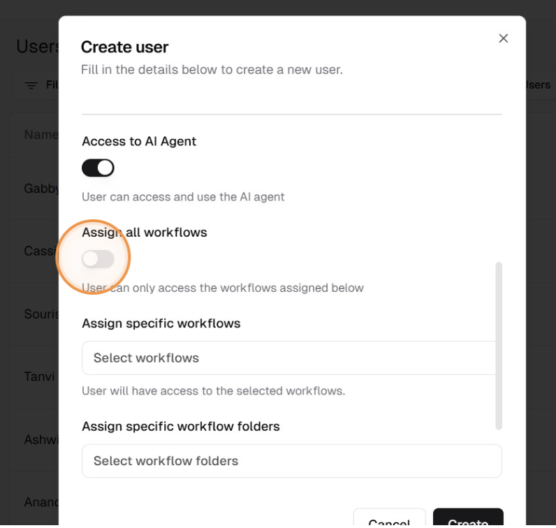 8. Access to workflows should also be set up based on the user's role in your organization. All workflows, individual specific workflows, or a workflow folder can be assigned